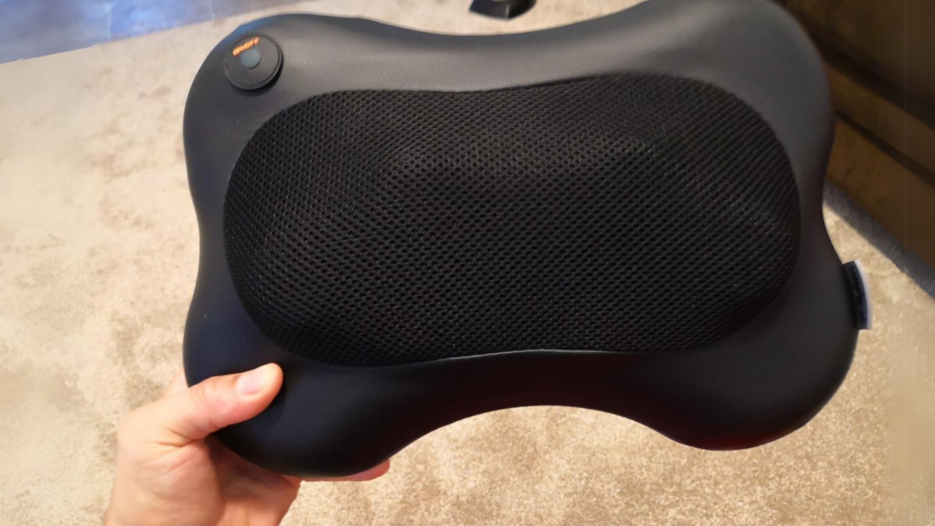 It’s designed with comfort in mind. You plug it into a wall socket and turn it on or off by pushing a button. Once on, the heat function is activated, and four soft silicone nodes, two on each side. rotated slowly, providing a soothing kneading sensation.