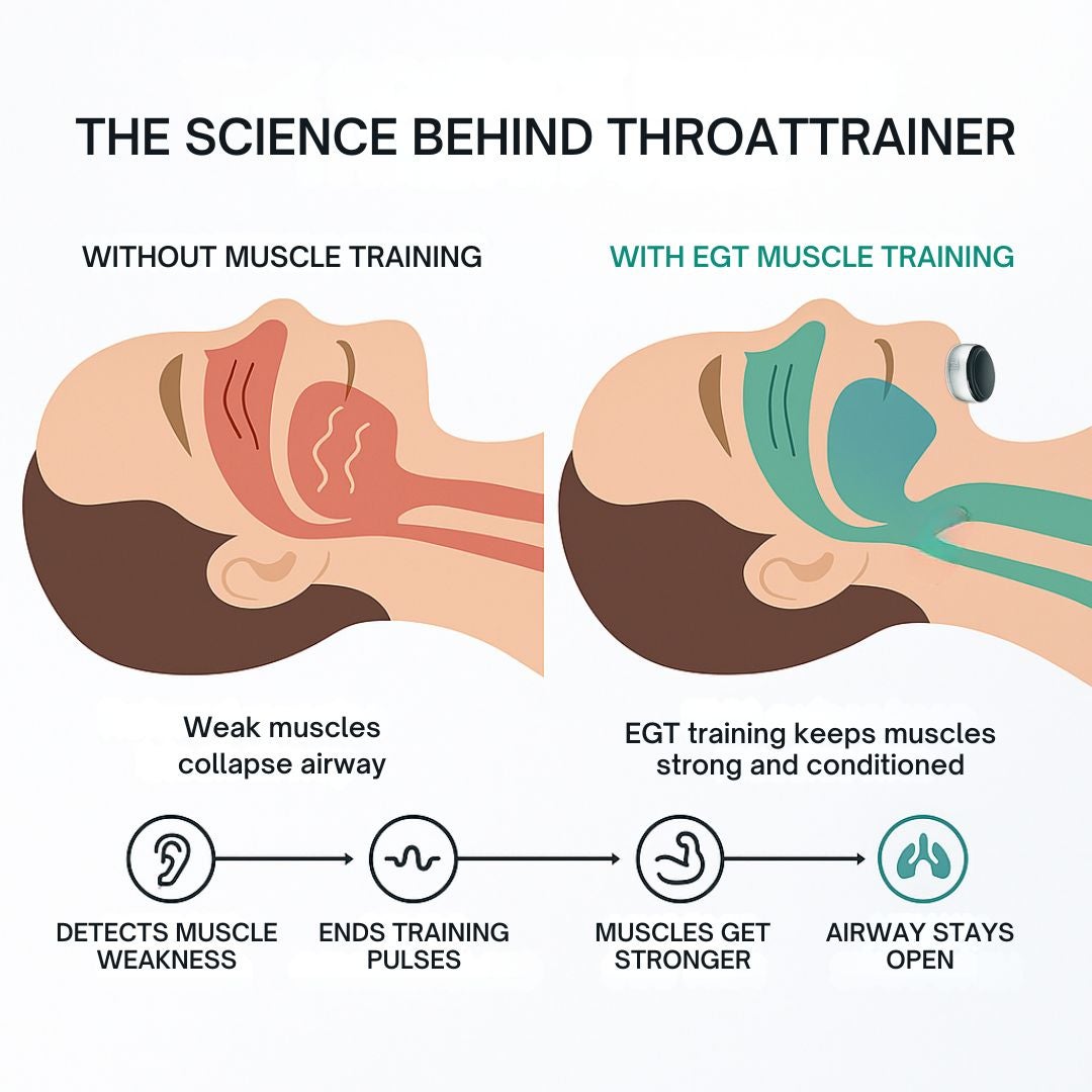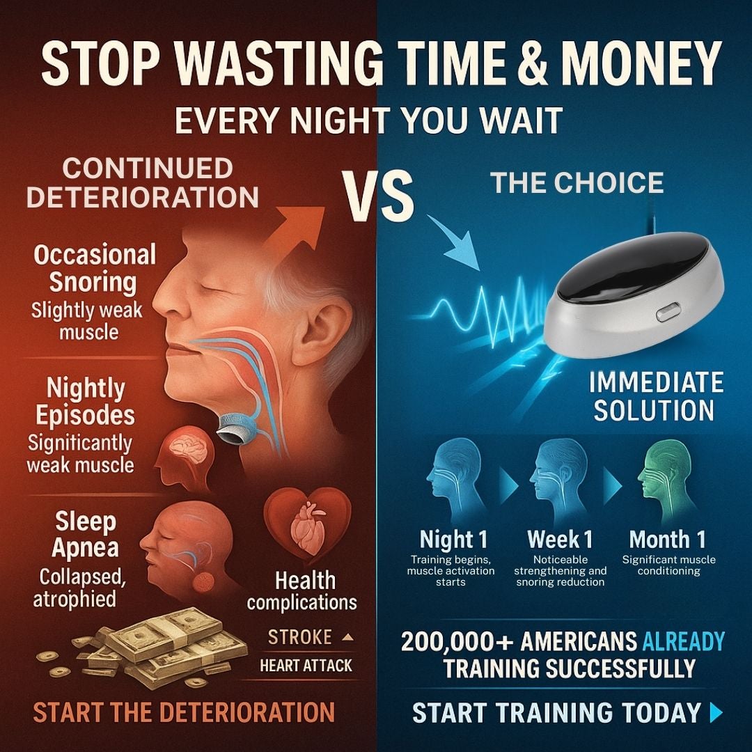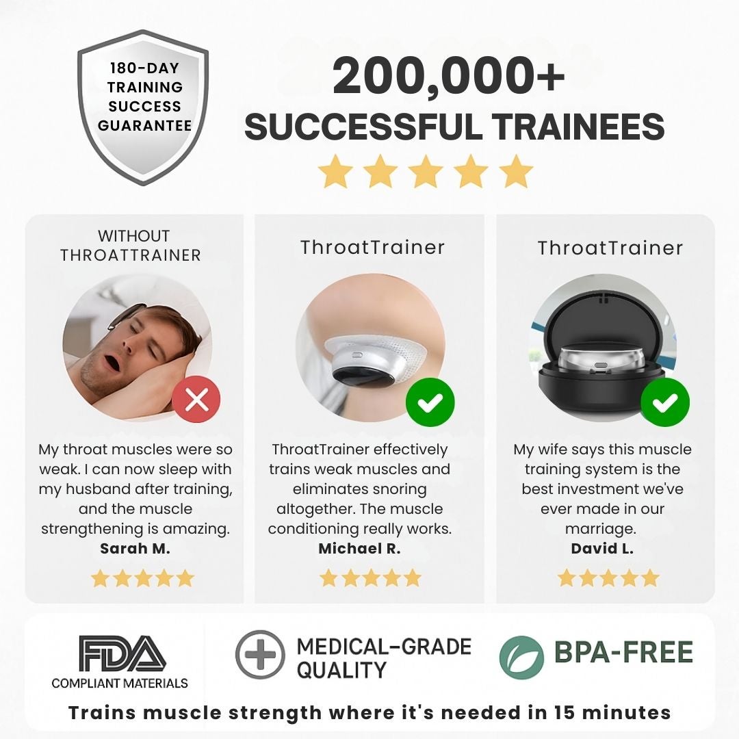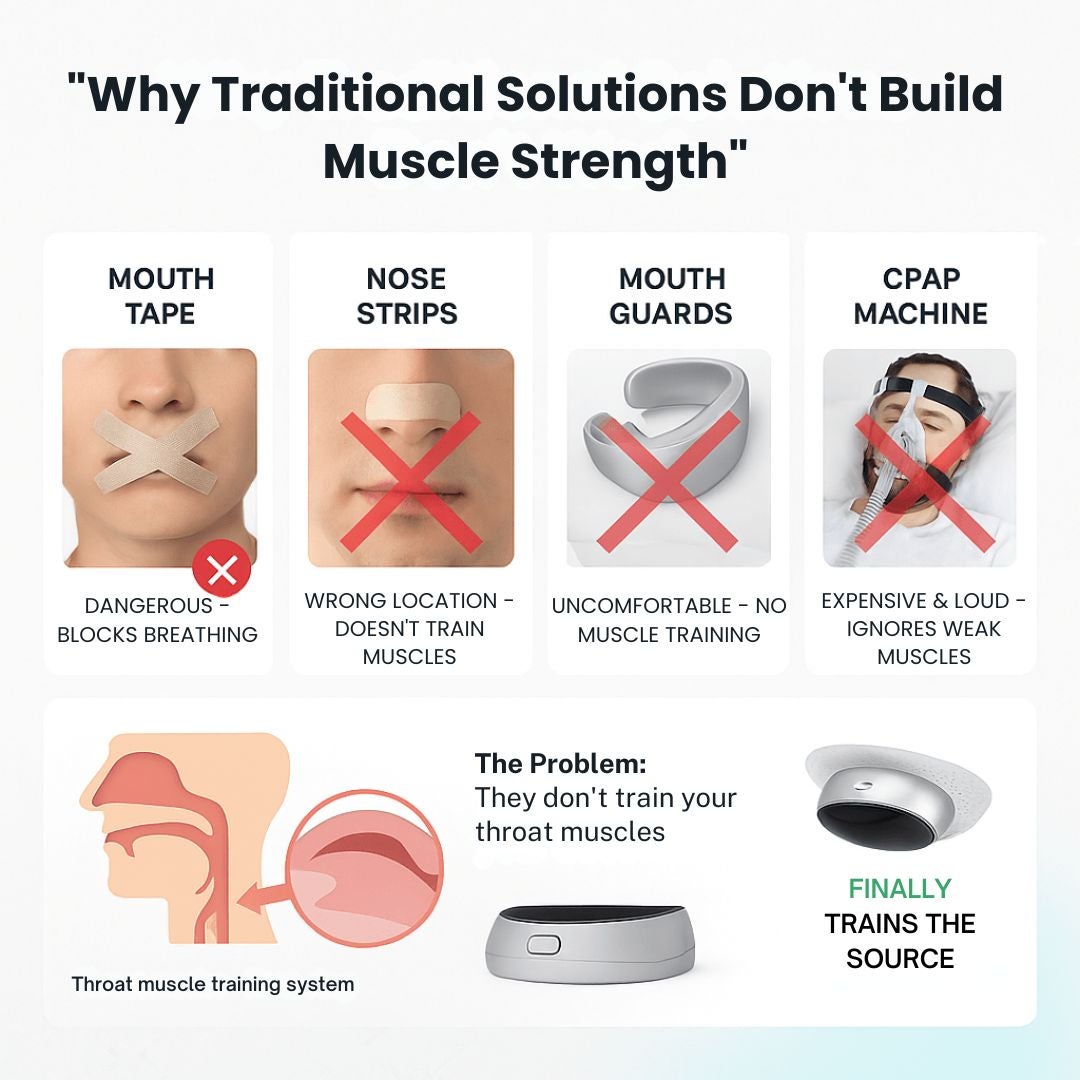 The Result: Your throat muscles stay weak and collapse while sleeping, snoring continues, and you're stuck with expensive equipment or invasive procedures that don't address the real problem.