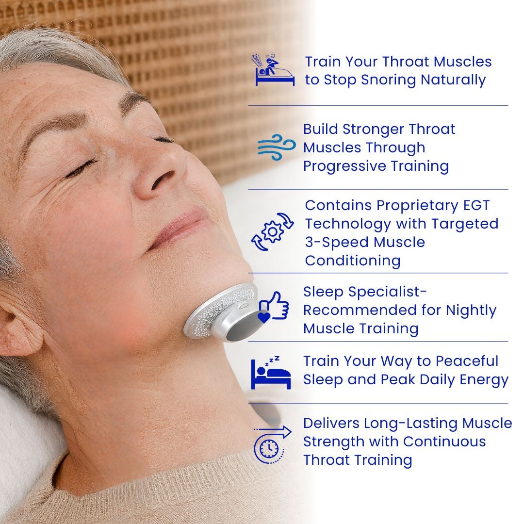 ThroatTrainer™ uses breakthrough Electronic Genioglossus Training (EGT) Technology that automatically detects when your throat muscle starts to weaken and sends precisely calibrated electrical pulses to exercise and strengthen it — building throat muscle strength to stop snoring.